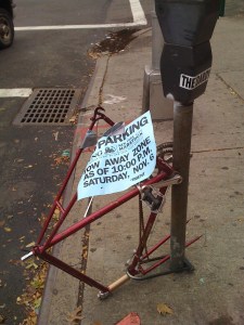 Contra this earlier post, this may be the saddest bike I’ve seen, if you can still call a frame stripped of everything except the chain and a pedal a bike. Interestingly, this bike is locked up with an old-style Kryptonite, the kind that was can be unlocked with a ballpoint pen. So perhaps this thief wanted to challenge himself. Or maybe he’s never seen the Internet. At least no marathon runners were inconvenienced.