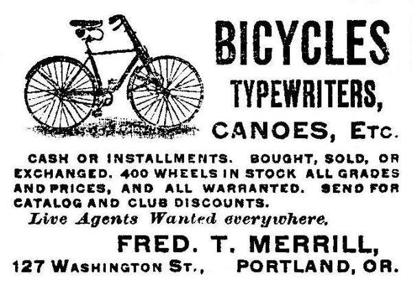 Via 718 Cyclery, here’s an amazing 1890 picture of Fred T. Merrill Bicycles, a shop in Portland, Oregon. I did a little more digging, and found this ad from the same shop, published a year later. Bicycles, typewriters, and canoes!