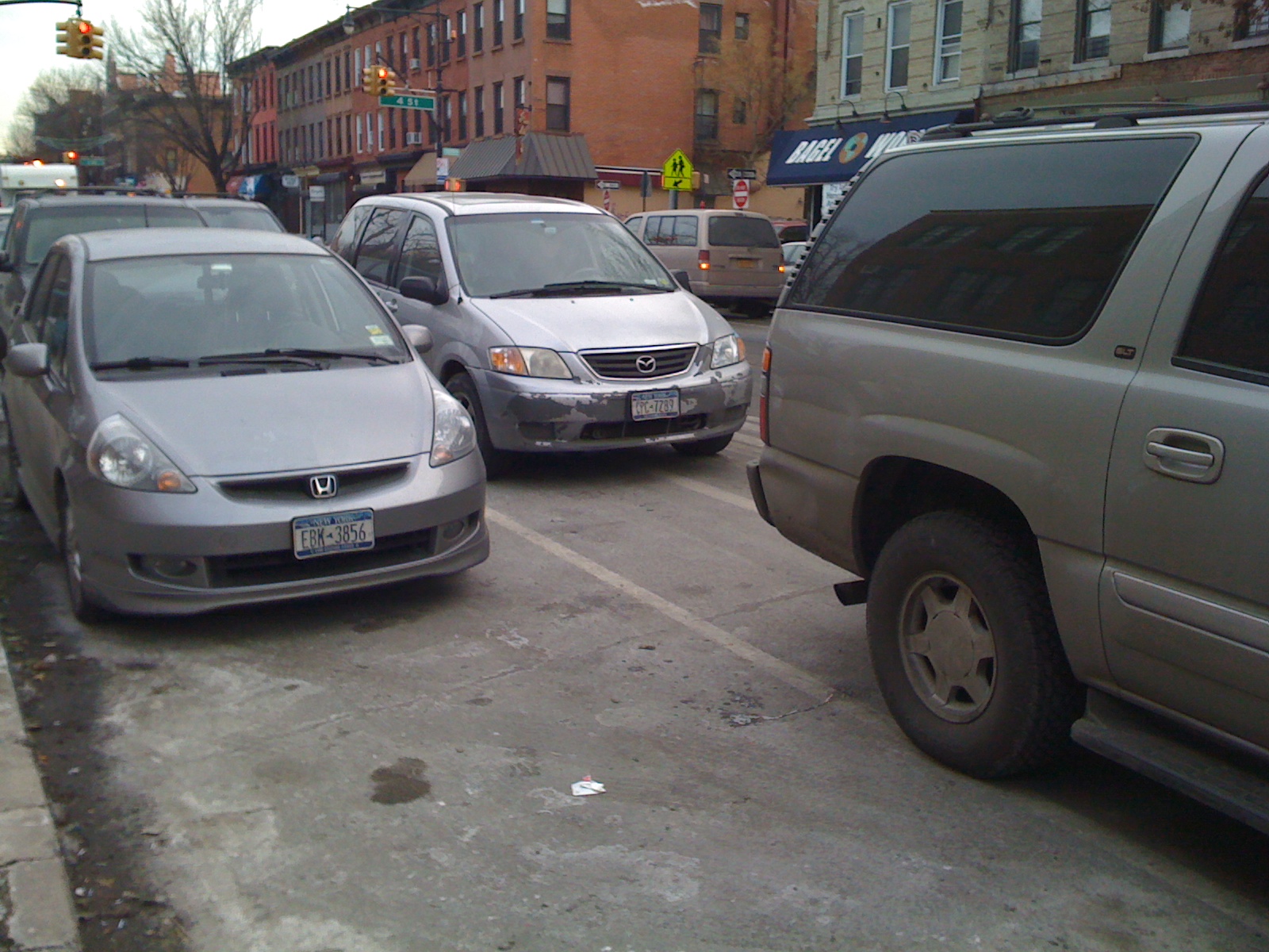 From the opposite side of the street, you’ll see that the driver of the maroon car has just pulled out from where she had been idling, slowing down the B63 bus. The driver of the Ford minivan was sitting there long enough that I was able to go into a Bagel shop on the corner, wait in line, get some coffee, and come back out to find him still sitting there.