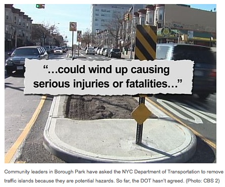 Unfortunately, that’s not how our local media sees things. You see it everywhere, no matter the debate. “Does the health care debate contain a provision for ‘death panels’? We’ll let both sides have at it after the break.” No. There are not two sides to every story. Balanced, objective journalism looks at facts first, opinions last. But unfortunately, that’s not how our local media works. Take this screen shot from a January 6 CBS2 report by Tony Aiello on pedestrian islands in Borough Park: