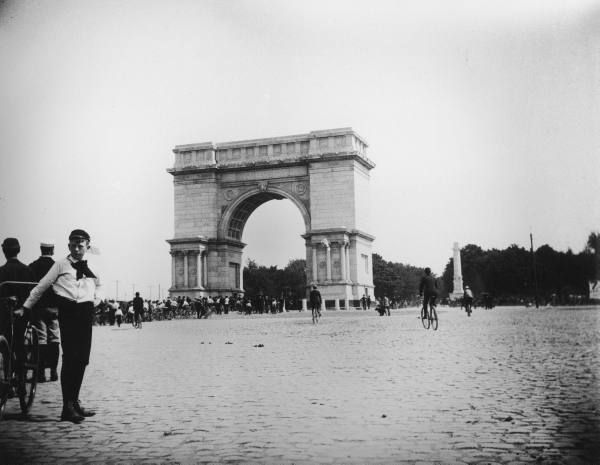 More Brooklyn bikes and cobblestones for you, this time from June, 1895. As with the last photo I found, there’s no statue atop the arch yet, and one gets the sense that walking from where this photo was taken to the monument would be easy, not at all like doing it today.