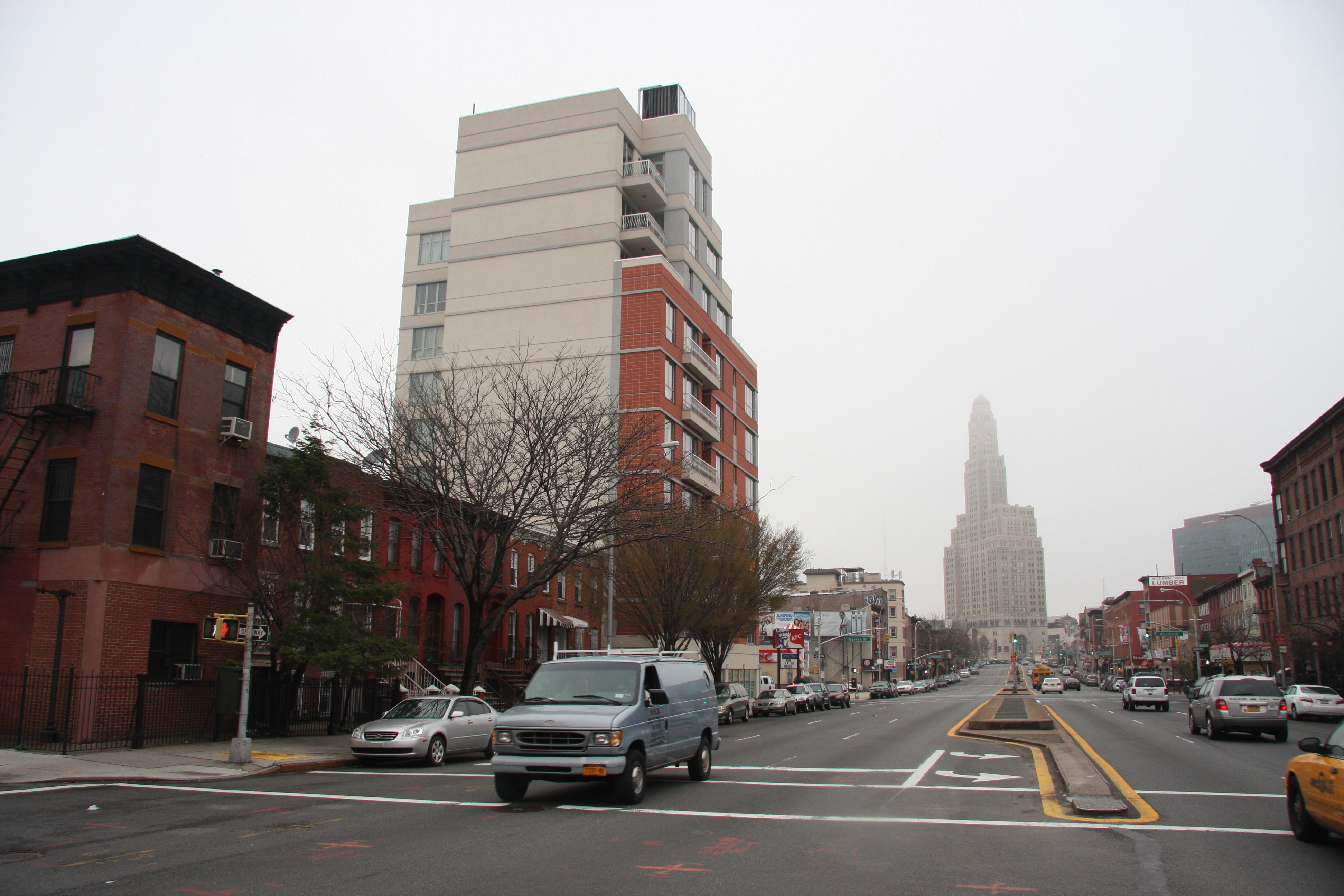 Above, a picture of Fourth Avenue in 1933 looking towards the Williamsburg Savings Bank tower. The building on the corner of Butler Street is still there, housing a bodega in its ground floor. Below, a picture taken from a similar vantage point today.