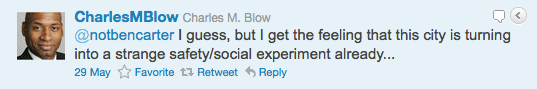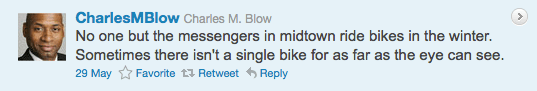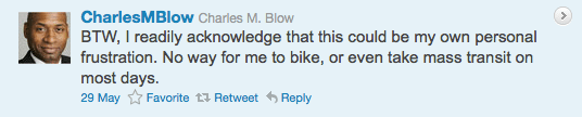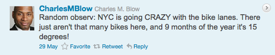 On Sunday, someone I follow on Twitter retweeted a true gem from Charles M. Blow, the Op-Art columnist for the Times. Like a social media version of John Cassidy, Blow quickly unleashed a torrent of irrational arguments against bike lanes in the tweets that followed. It was almost as if he sent out the first one, realized his mistake, but then couldn’t stop himself from trying to have it all make sense.