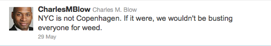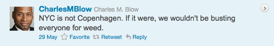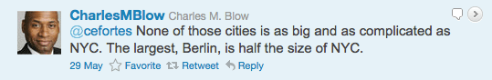One of Blow’s followers stepped into the fray, presumably tweeting, “Portland, Amsterdam, Copenhagen, Berlin and DC have robust bike lane networks. Why not NYC?” Here’s Blow’s response: