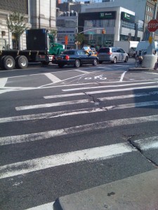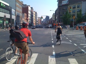 Once bike commuters cross Canal Street they have to ride up Bowery. And that’s when things go from merely inconvenient to downright deadly. I simply can not believe that DOT will allow cyclists to continue to ride this way, although one DOT staffer I spoke to on my way home admitted that they are hoping cyclists will find other safer routes. (“I probably shouldn’t be saying this,” she said.) I don’t see how it’s possible to avoid the Bowery, at least for a block or two, and if you want to go uptown there’s no way around crossing Canal.