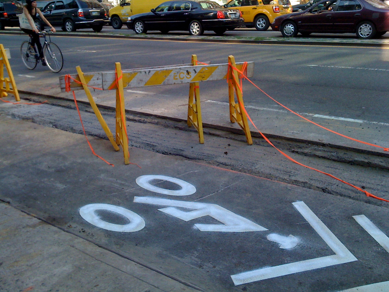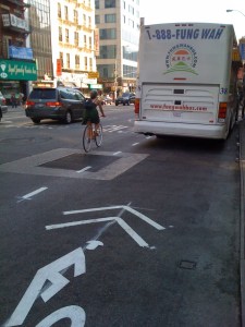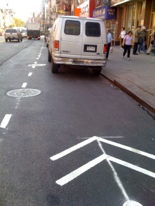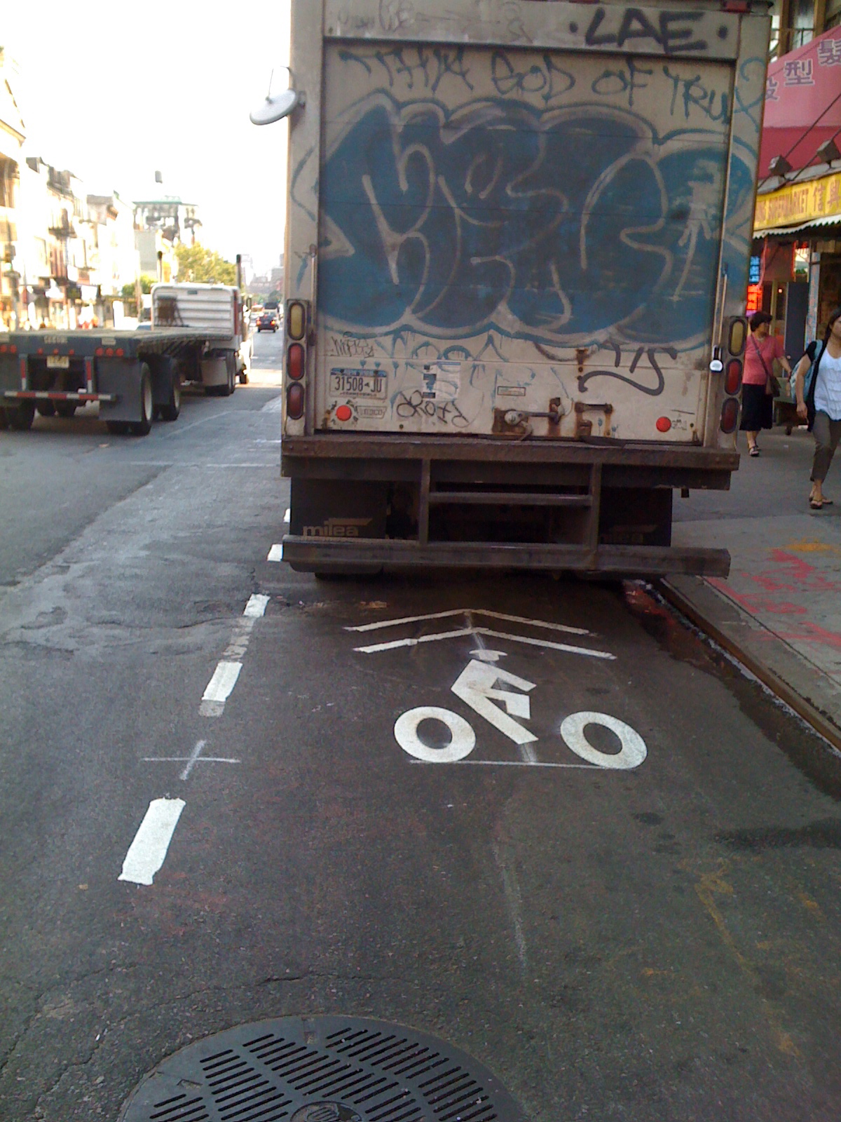 What is needed along the Bowery is a mix of bollards, jersey barriers, and other features that will keep cars and bikes separate from each other. I am sympathetic to the reality that many of the businesses along the Bowery need the curb space to make deliveries, so perhaps DOT could place designated loading areas every block or two. If business owners complain, DOT can tell them what they’re telling cyclists: it’s only temporary.