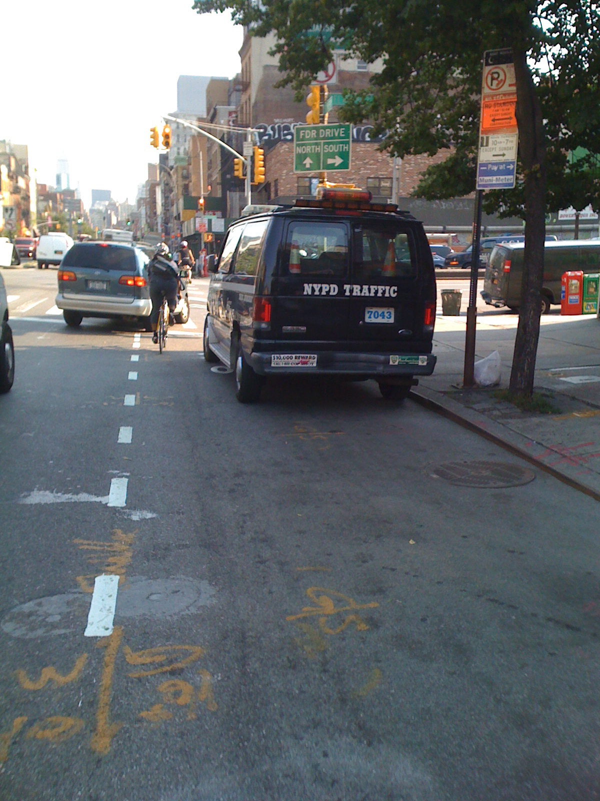 Not surprisingly, most of the trucks I saw turning onto the bridge approach did not yield for cyclists. And what greeted cyclists after they got onto the freshly painted Bowery bike lane? An NYPD van, of course! If ever there was evidence of the chasm between DOT and the NYPD, this picture is it: