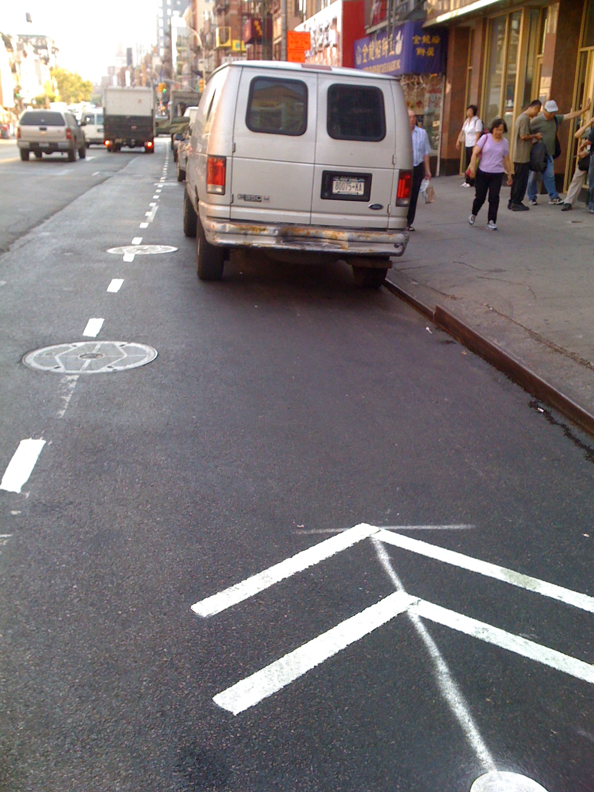The Bowery may as well have not been marked at all, given the frequency with which the bike symbols, dotted lines, and sharrows were ignored. And without enforcement or barriers to standing, the problem is only going to get worse as this new configuration becomes routine within a few weeks.