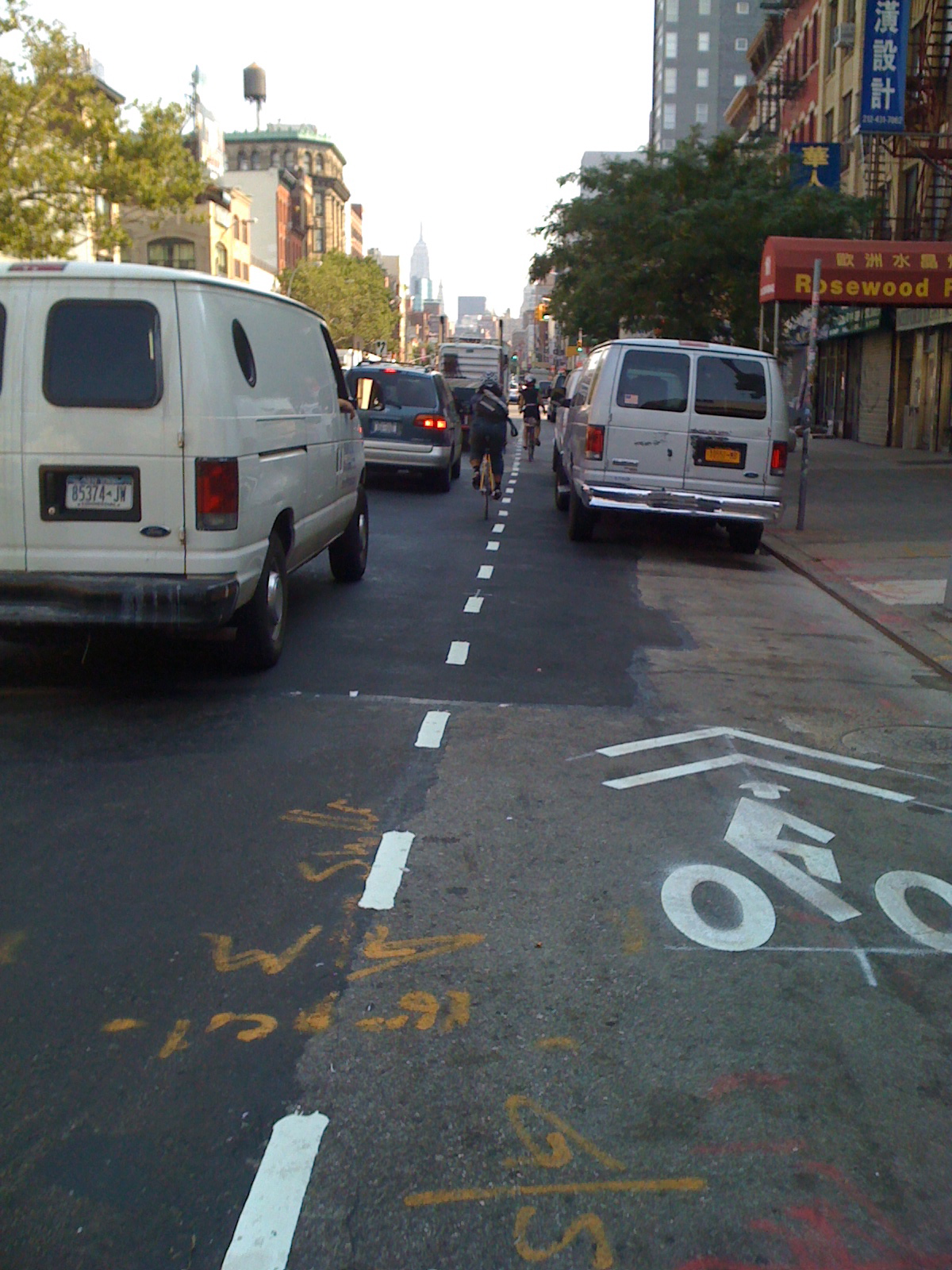 But then I got to the Manhattan side. I believe DOT has turned what used to be one of the safest, most pleasant commutes in the city into one of the most dangerous. Cyclists are dumped onto the Bowery, just under Canal, with little separating them from traffic. There is a bike lane for only the first few meters; the rest is dotted lines and sharrows. (You’ll never appreciate how much drivers actually do, in fact, respect painted, buffered bike lanes until you rely on sharrows to guide your commute.)