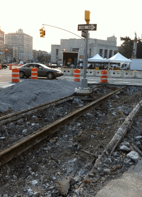 Susan Kille posted this picture to Twitter over the weekend and it’s a great one. The current onstruction on Grand Army Plaza briefly exposed a set of old trolley tracks at the top of Union Street. If a picture is worth a thousand words, then this was a real-life example of the ever-changing nature of our borough’s streets. By the time I rode up to the park on Sunday morning, the tracks were already covered over by the gravel seen piled to the left.