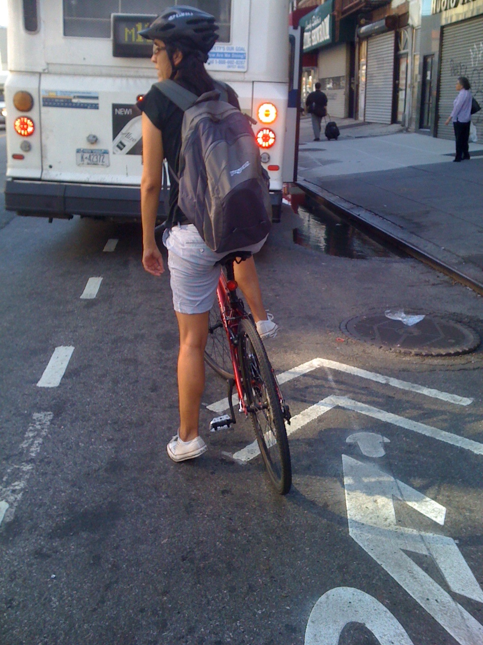 The Bowery isn’t the only street in New York where cyclists have to watch out for buses pulling into stops, of course, but given the fast traffic in the other lanes, it means cyclists find themselves choosing between waiting for a bus to load passengers and taking their chances in traffic.