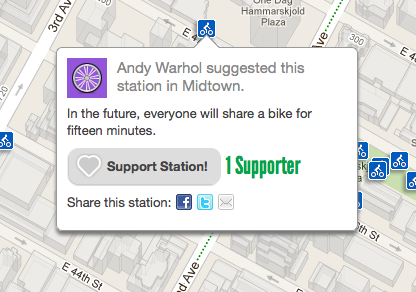 Here’s my contribution to the New York City Bike Share suggestion map, at the original location of The Factory. Maybe Andy himself would have been a big bike share user; had it existed when he was alive it would have made getting from 47th and 3rd to Studio 54 fairly easy.