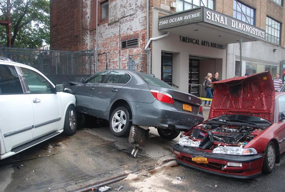 The Infiniti slammed into a maroon Nissan Altima, leaving a chunk of his bumper in the Altima’s windshield and ripping open its side. The Altima nipped the Mercedes, while the Infiniti continued on. It careened into a row of park vehicles, nicking one and tossing the other – a BMW 525i – into the same gate that eventually forced the Infiniti to come to a halt. An Acura parked behind the BMW took a chunk of the momentum out of the impact, crushing its hood.