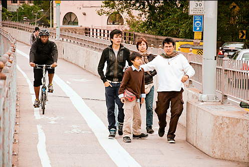 The story tells the uniformed that “clashes between cyclists and skyscraper-gawking tourists are frequent” and that ten weeks after safety monitors were stationed on the bridges, “both sides still aren’t playing nice.” Words like “disarray” and reports of stroller-pushing moms being “nearly knocked down” pepper the piece like a tabloid-themed Mad Libs. There’s even an ominous quote from one of the pedestrian safety managers who says that “there haven’t been any accidents…yet.” The next piece of information that comes is the end date for the “pilot program,” as if we should expect to see an explosion in bike-on-ped conflicts and injuries the minute these noble–and highly paid–traffic cops relinquish their posts.