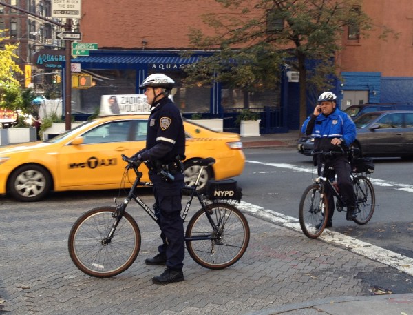 A sight as rare as baby pigeons: NYPD officers on bikes. Spotted outside of my office on the corner of 6th Avenue and Spring Street.
