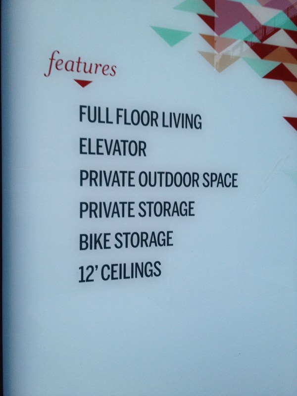 Spotted in the window of the new condos going up on the corner of St. Johns Place and 5th Avenue. I’m starting to notice that bike storage, which in this condo is listed as a separate amenity from private storage, is becoming an increasingly common marketing tool in Brooklyn real estate these days. If cyclists are an indicator species for a healthy city, then ads like this are their own indicators.