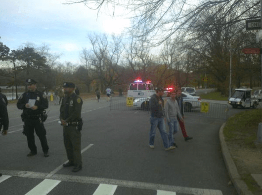 A reader sends in this picture of the Prospect Park loop on Saturday, where a major NYPD and PEP presence blocked off part of the drive in an effort to slow down cyclists. The particular location was the site of two serious cyclist/pedestrian collisions in recent months and prompted the installation of the “chute,” and the formation of the Road Sharing Task Force. I am told officers were distributing information as part of an education campaign about the rules of the road.