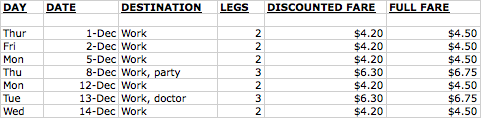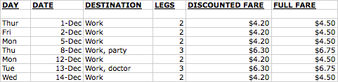 I only included trips, or legs, that would have otherwise been taken on a public transit had biking not been an option; trips to the grocery store didn’t count, even though I frequently shop by bike. I also didn’t include trips made possible because of biking, such as a visit with a friend in Greenpoint whom I never would have agreed to meet if it had involved a transfer to the L in Union Square.