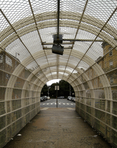 That’s just a small sampling of the very severe-looking pedestrian bridges that dot the five boroughs. Even one of the newest and nicest looking pedestrian bridges in the city, the Intrepid Museum Pedestrian Bridge across the West Side Highway, includes high fencing that prevents people from throwing things into the traffic below.