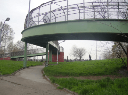 The above image is a pedestrian overpass at the BQE on-ramp at Calvary Cemetery. As you can see, there aren’t even any railings on this bridge — it’s all fence. It’s a piece of infrastructure more appropriate for herding cattle to the slaughterhouse than for inviting pedestrians on a pleasant stroll.