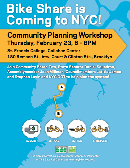 Join Brooklyn’s Community Board 2 and local residents and business owners at a roundtable planning workshop to help decide how bike share should work and where stations should go in Downtown Brooklyn, DUMBO, Boerum Hill, Fort Greene, Brooklyn Heights and Clinton Hill. In partnership with Community Board 2, NYC Council Members Letitia James and Stephen Levin, and NYS Senator Velmanette Montgomery. The Workshop will be held at St. Francis College, Callahan Center, 180 Remsen Street.