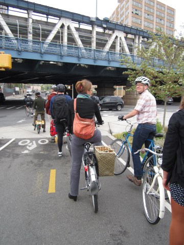 I’ve been following the efforts of Kim Burgas, Kimberly Kinchen, and Rod Huntress as they get the NYC Biketrain movement off the ground. I’ve even joined in on one of the Brooklyn rides. It’s a fun way to get to work and a safe introduction to bike commuting for anyone who might be a tad too nervous to try it alone. Plus, unlike a regular train ride, it’s all but impossible to sit next to someone clipping his fingernails.