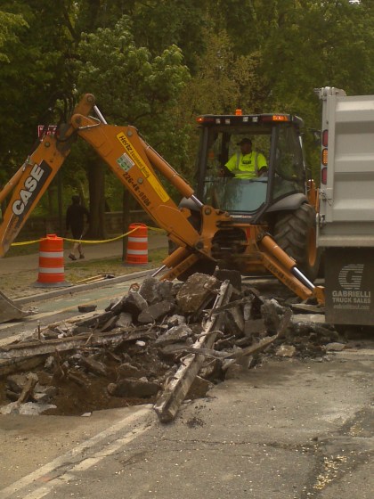 DOT crews installing the new pedestrian islands on Prospect Park West have unearthed the old streetcar lines that used to run along the boulevard. You may remember that tracks were also unearthed at Union and PPW when DOT began constructing pedestrian and cycling improvements to Grand Army Plaza last year.
