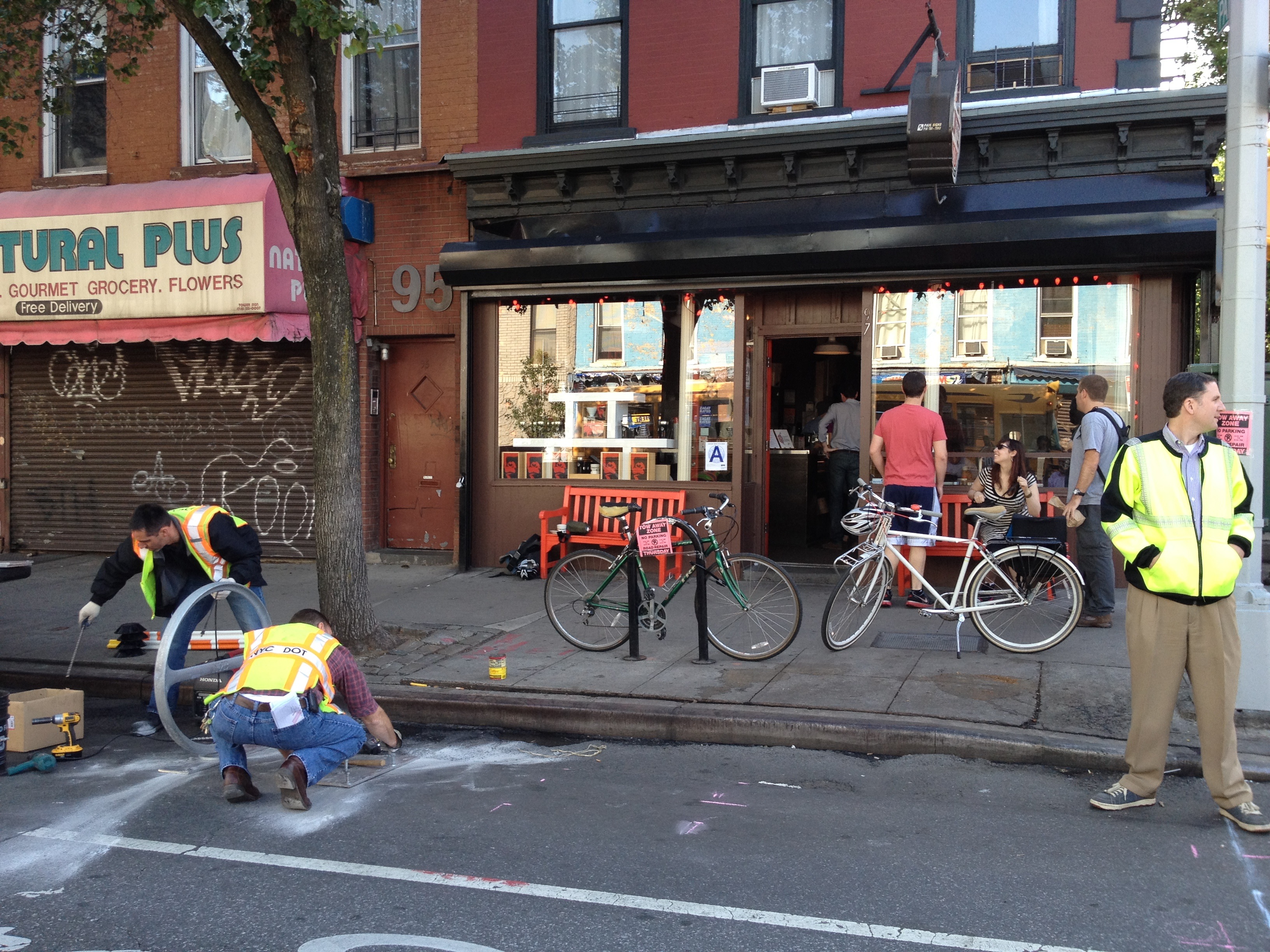 This morning, on-street bike parking was installed on 5th Avenue and Park Place, right in front of Gorilla Coffee. It’s only the third bike corral in the city and even though it was only completed within the last hour or so of this posting, it’s already seeing some action as shown in the photo above.