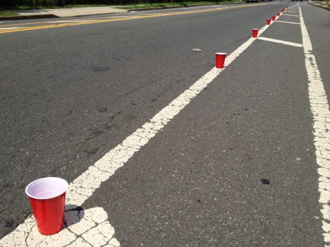 So, armed with a stack of cups and a roll of duct tape, I set out for Franklin Street and stopped shortly after North 14th Street. There, I set up this makeshift bike lane: