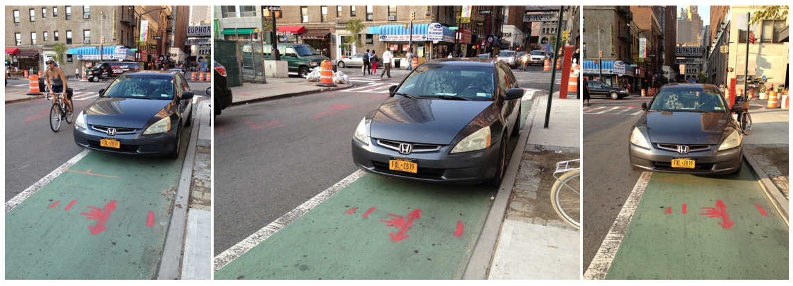 I couldn’t make out what it says, but the fact that it’s so faded is good evidence that this bike lane abuse has been going on forever. What’s really galling about this is that there’s almost always an open space directly across the street: