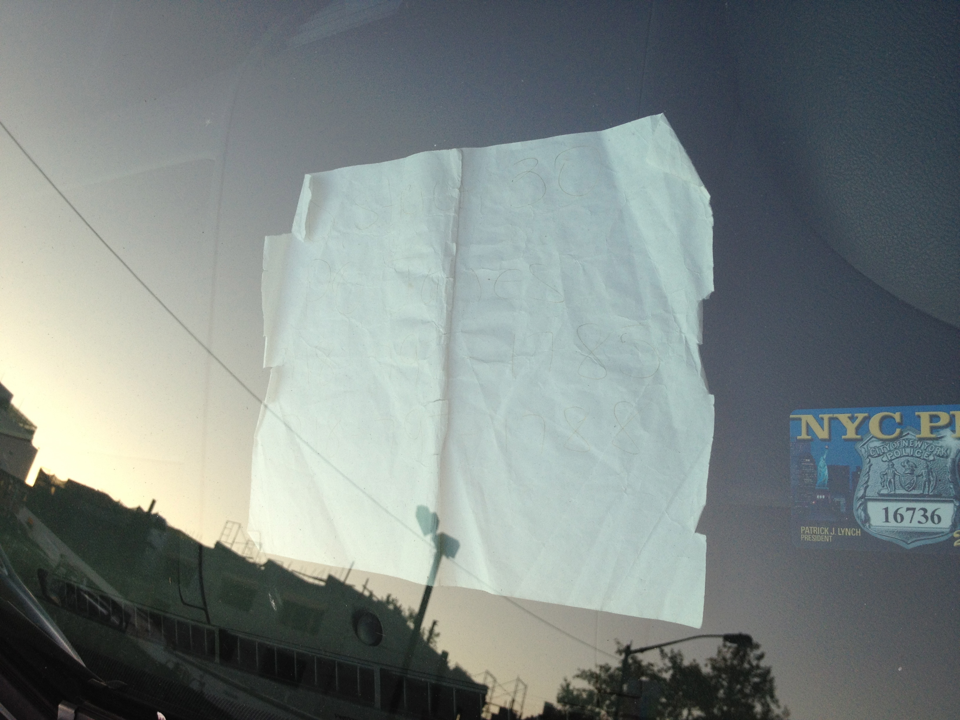 Those are cards from the Patrolmen’s Benevolent Association. In addition, this faded piece of paper is also on the dash: