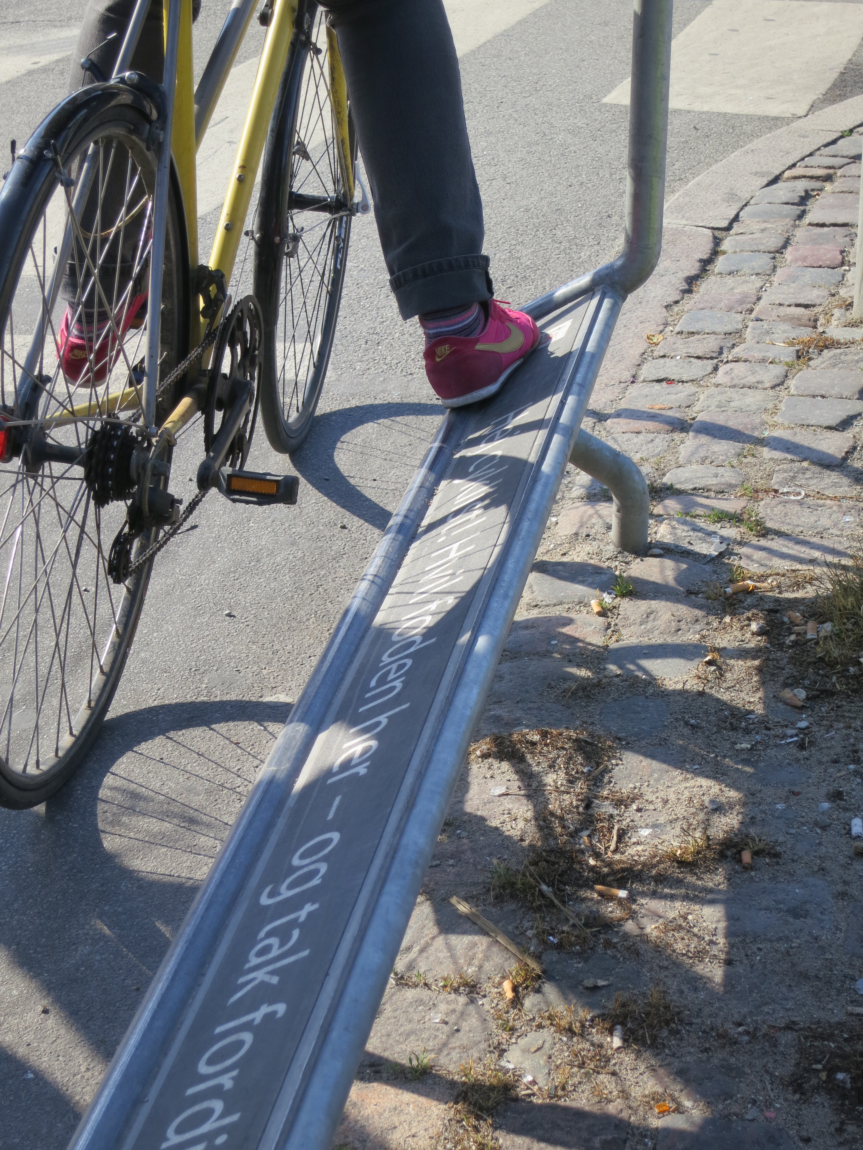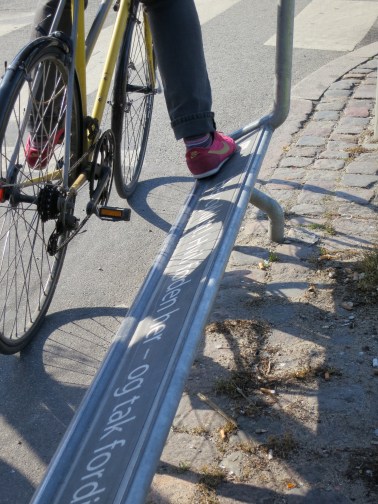 There are certainly a few spots around New York where a Copenhagen-style railing with some sort of positive message would make sense. In addition to brightening someone’s day it might have the unintended effect of getting people to stop for red lights. In fact, why not give Copenhagen’s version a New York twist? “Hi, cyclist! Rest your foot here while you wait for the light…and thank you for cycling in the city.” Since I’m of the opinion that it always makes more sense to tell people what you want them to do rather than not do, this would be a far more positive and effective message than “Don’t be a jerk,” no? It would be like the city saying, “We’re doing our part, now please do yours.”