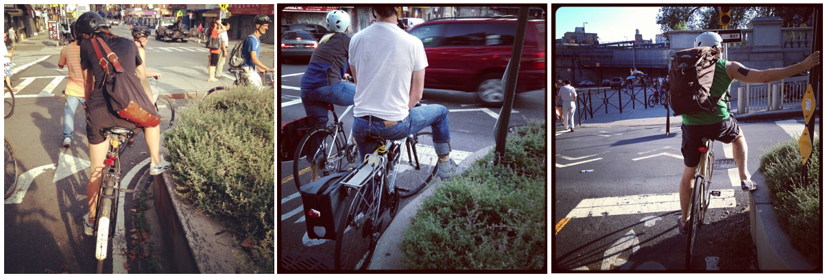 Perhaps my favorite piece of cycling infrastructure in New York City is its most unintentional. No one designed a footrest for cyclists to use as they wait for the light to change to get onto the Manhattan Bridge, but that’s exactly what you’ll find at the end of the concrete planter that protects the short bike lane on Canal Street. Not a day goes by that I don’t see someone using the ledge to get a leg up, so to speak, and when I’m at the front of the herd I love taking a short break there myself.