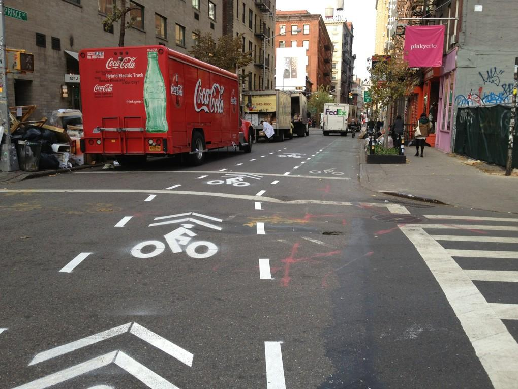 You may have noticed the above change to the Prince Street bike lane between Mulberry and Lafayette during your crosstown commute recently and wondered what’s happening. I contacted a source at DOT and the good news is that there is no long-term change in store for this block; the shift to the left is due to the impending construction of a commercial building “which will temporarily close the curbside bike lane.”