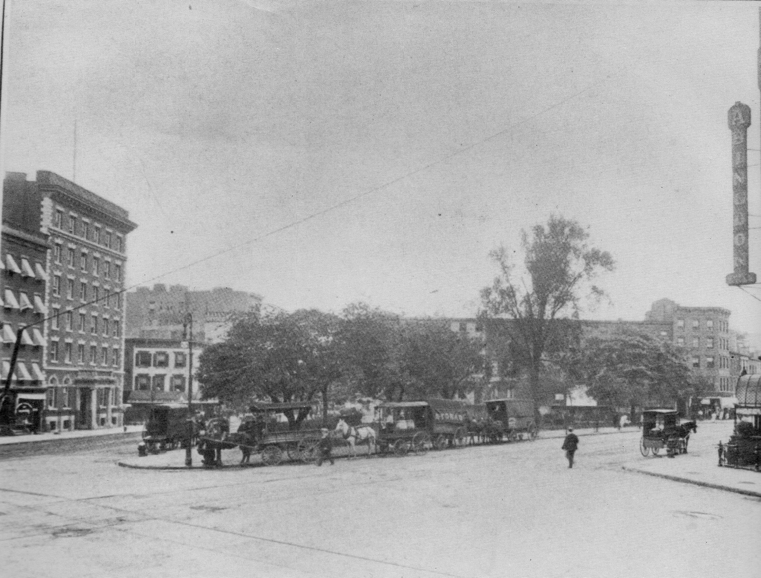 Abingdon Square became a public park in 1831. Surely such futuristic structures as the electric cable stretching across Hudson Street and 8th Avenue and the [theatre? hotel?] sign that reads “Abingdon” would have looked completely odd and out of place to the Villagers of the pre-Civil-War era when they first laid eyes on them.