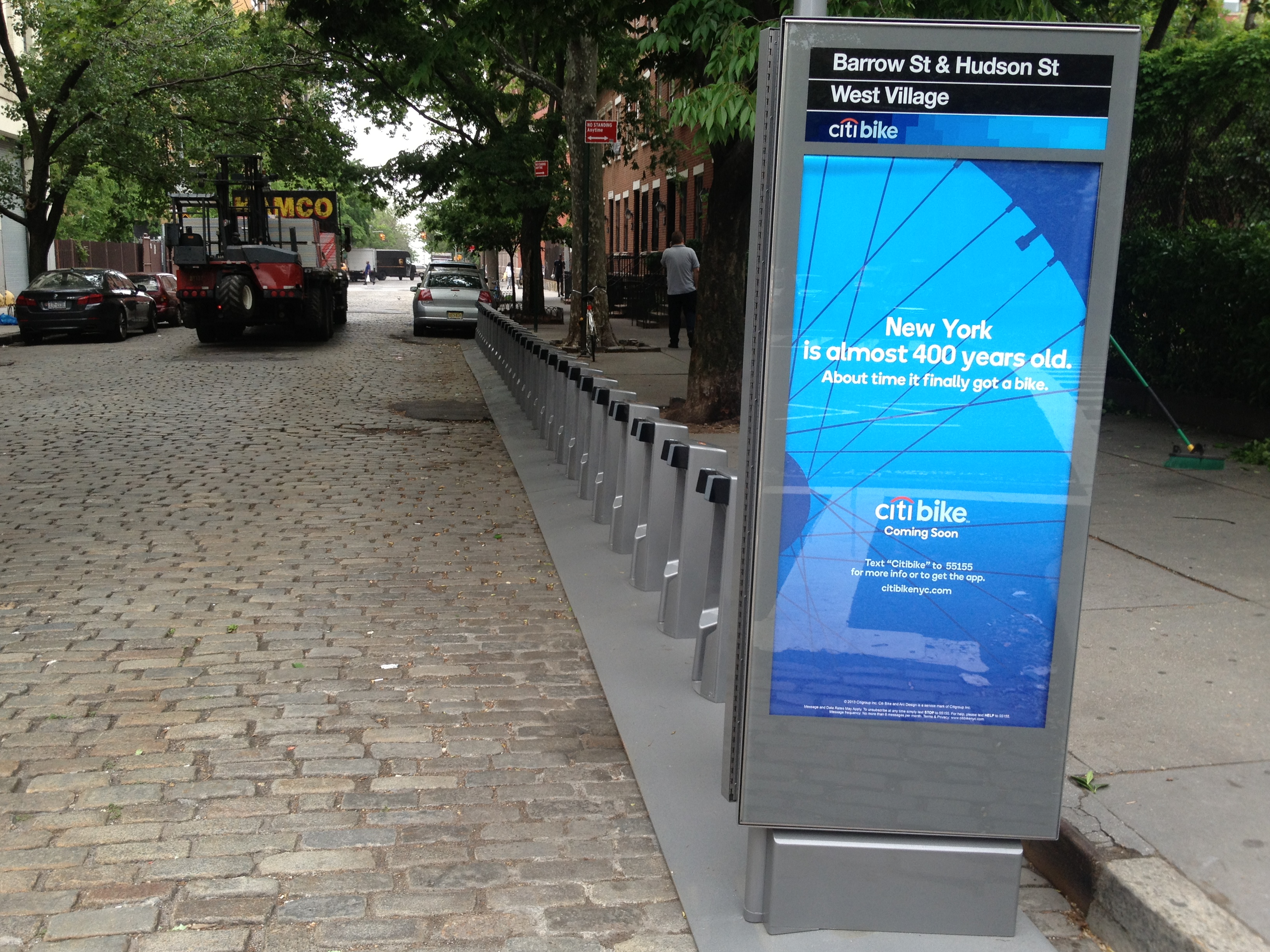 In a reverse 99 Bank Street, the station was moved from blacktop to cobblestones, which opponents of all things bike are usually happy to tell you trump all other road surfaces in the historic accuracy department. Plus, all of the typical concerns over how cobblestones affect the safety of cyclists and pedestrians by forcing people on bikes onto the sidewalk don’t seem to exist now that the station isn’t in front of anyone’s apartment building. (Right before I took this photo, a cyclist did, in fact, turn off of Hudson and onto the sidewalk to go west navigating peacefully around two unfazed pedestrians, an incident you won’t read about in the Post.)
