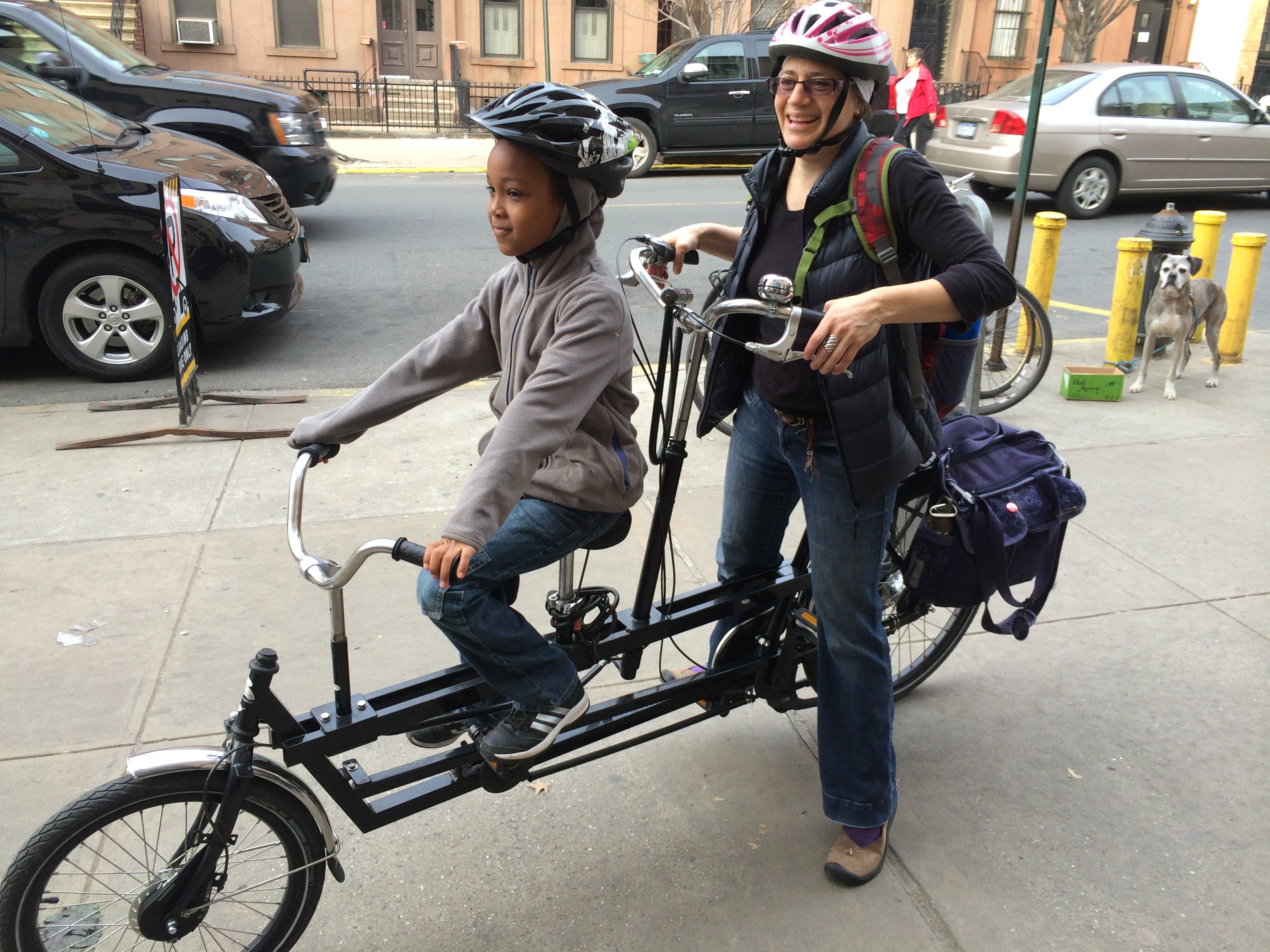 That same day I met Lisa and her son in front of the Park Slope Food Co-Op, about to take off on their Onderwater tandem. As you may recall, they’re the subject of a photo I submitted to a Streetsblog contest last year. I frequently see them on 5th Avenue on their daily school run, so it was nice to finally meet the people on the “Amsterdam bike,” as my daughter calls their sweet ride.