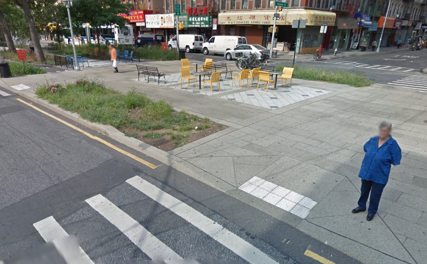 Cyclists traveling West on Rivington Street are directed by official signage and pavement markings to cut through Sara D. Roosevelt Park. This requires crossing the sidewalk at Rivington and Forsyth, riding through a shared space in the park, and crossing the sidewalk along Chrystie Street to continue on to the Bowery. (There’s also a Citibike station in the park.)