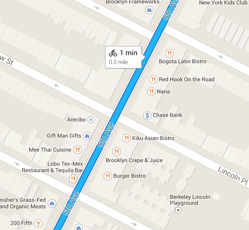 The light ahead was red and there were a few cars stopped waiting for it to change. The bike lane on Lincoln Place is on the left side of the street and I needed to turn right, so I merged behind a car and waited too. When the light changed, the cars began moving and I slowly turned right onto 5th Avenue. Here’s the route: