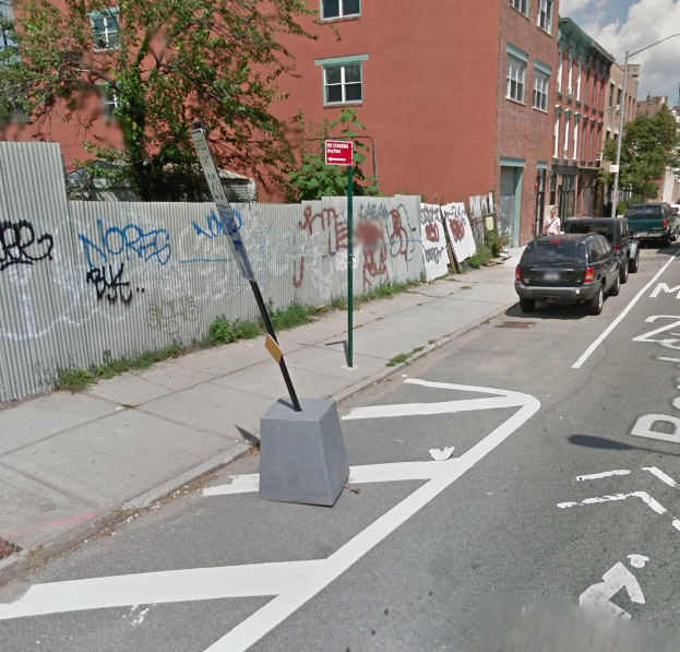 Here’s an example from Union and Bond Street in Brooklyn. This is the Slow Zone gateway as it existed in October 2013: