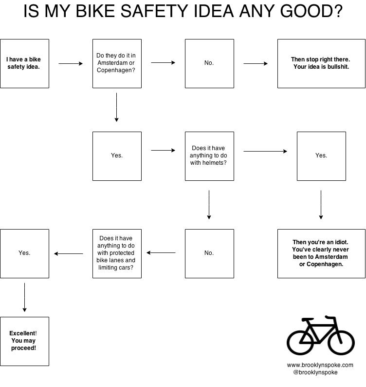 Let’s say you’re an inventor or entrepreneur and have a new product that you think will “change everything” about the future of bicycle safety. Or perhaps you’re a writer for a website that relies on click bait and figure that promoting a story about “the Modern Safety Solution Cyclists Have Been Begging For,” will drive a lot of traffic. Here’s a helpful flowchart to help you decide if you’re actually on to something or if you’re just wasting everyone’s time. (Click to enlarge.)