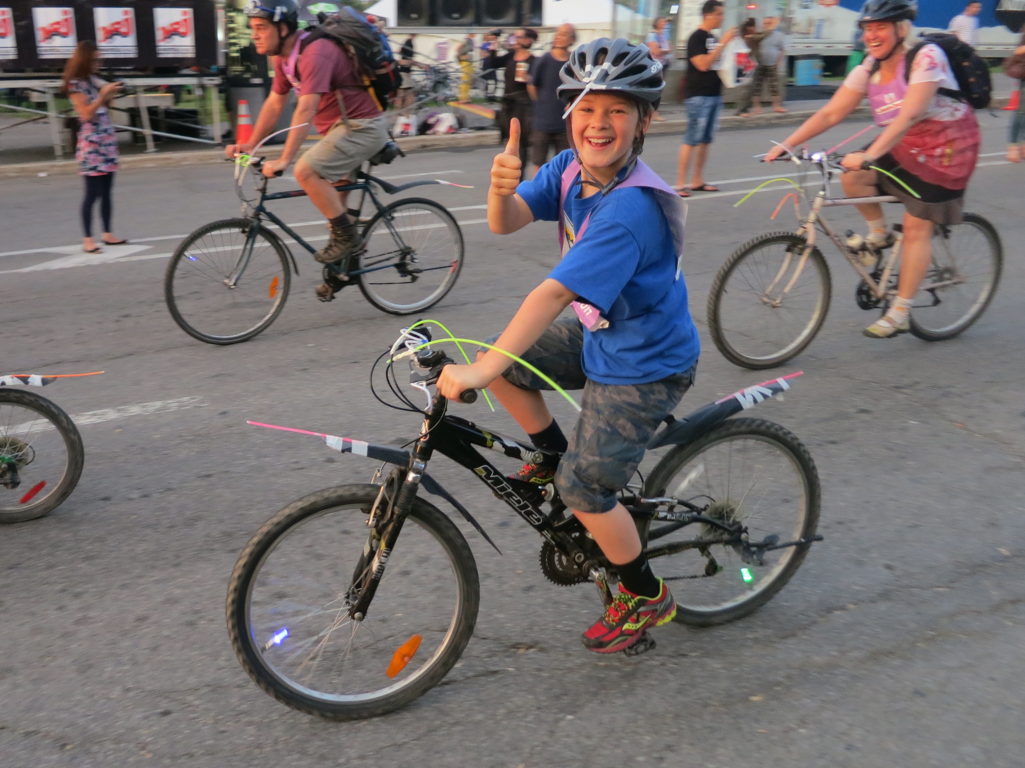 A 21-kilometer ride takes some people an hour or less, although there are rewards to taking it slow. The real action during the Tour La Nuit comes, of course, during the darkness. The streets of Montréal become a sparkling galaxy of blinky lights, glowsticks, and reflective bike gear. Clarence at Streetfilms captured some of the magic of the 2014 Tour La Nuit in this film, but there’s truly nothing like being there. Think about being this kid, riding through the city at 9 or 9:30 PM — or even an hour or two later! — on streets that are normally off limits to anyone without a driver’s license.